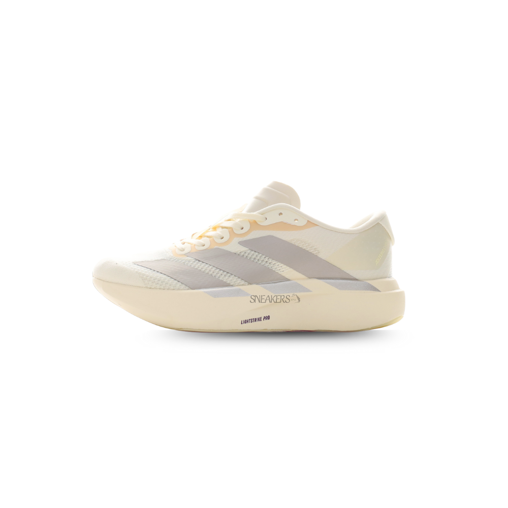 The Adidas Adizero Adios Pro 3 shoe in Off White/Grey is designed for runners seeking maximum speed and professional performance.
